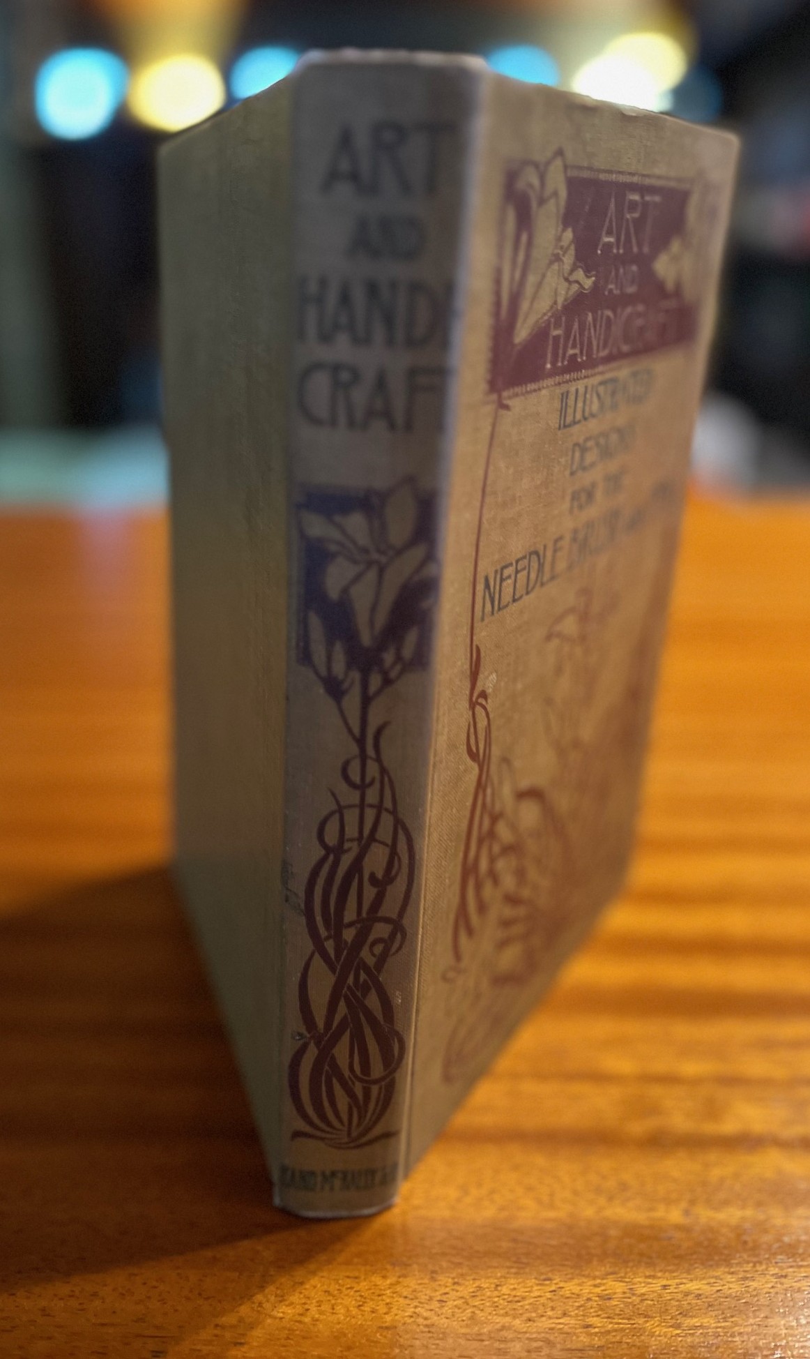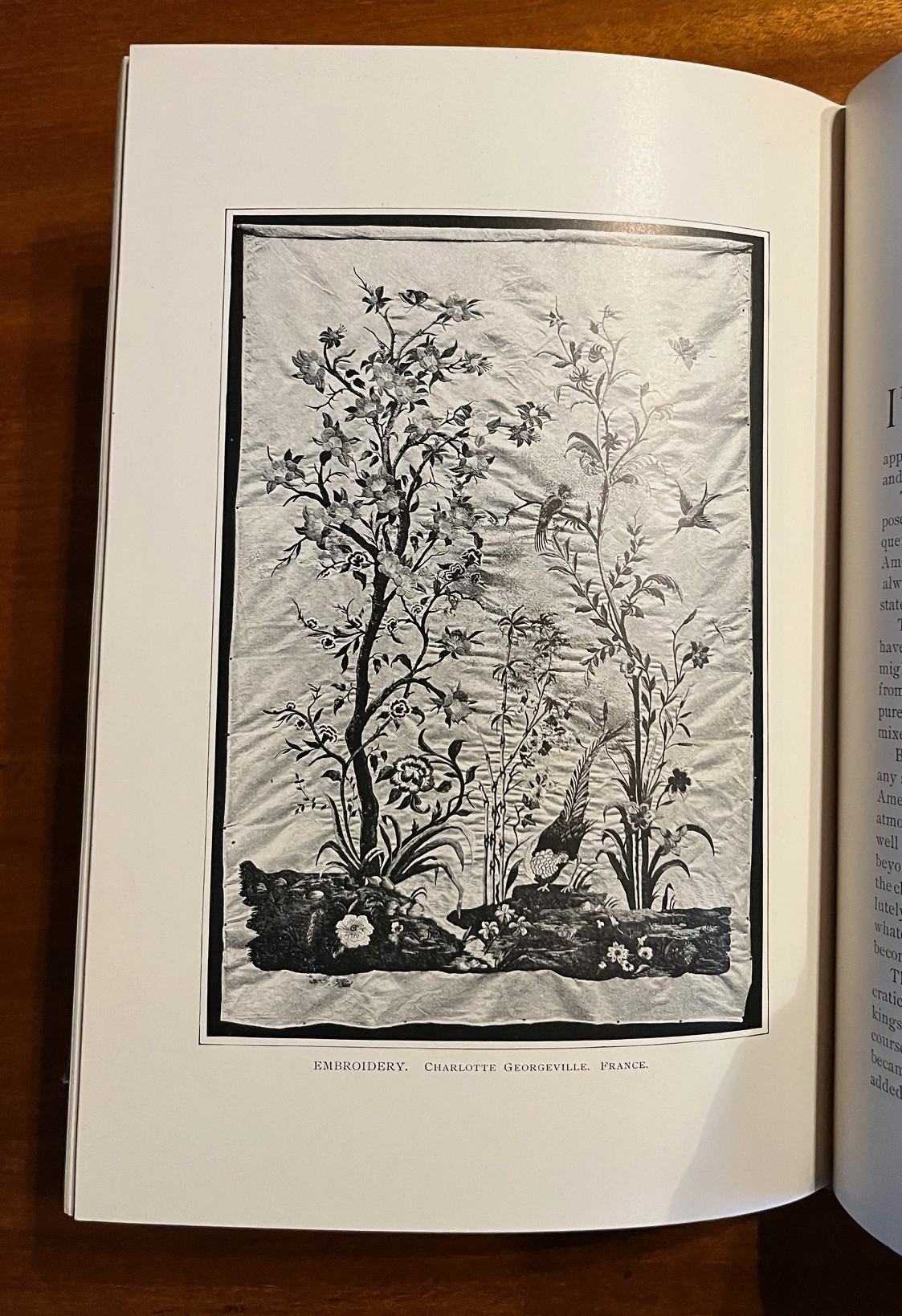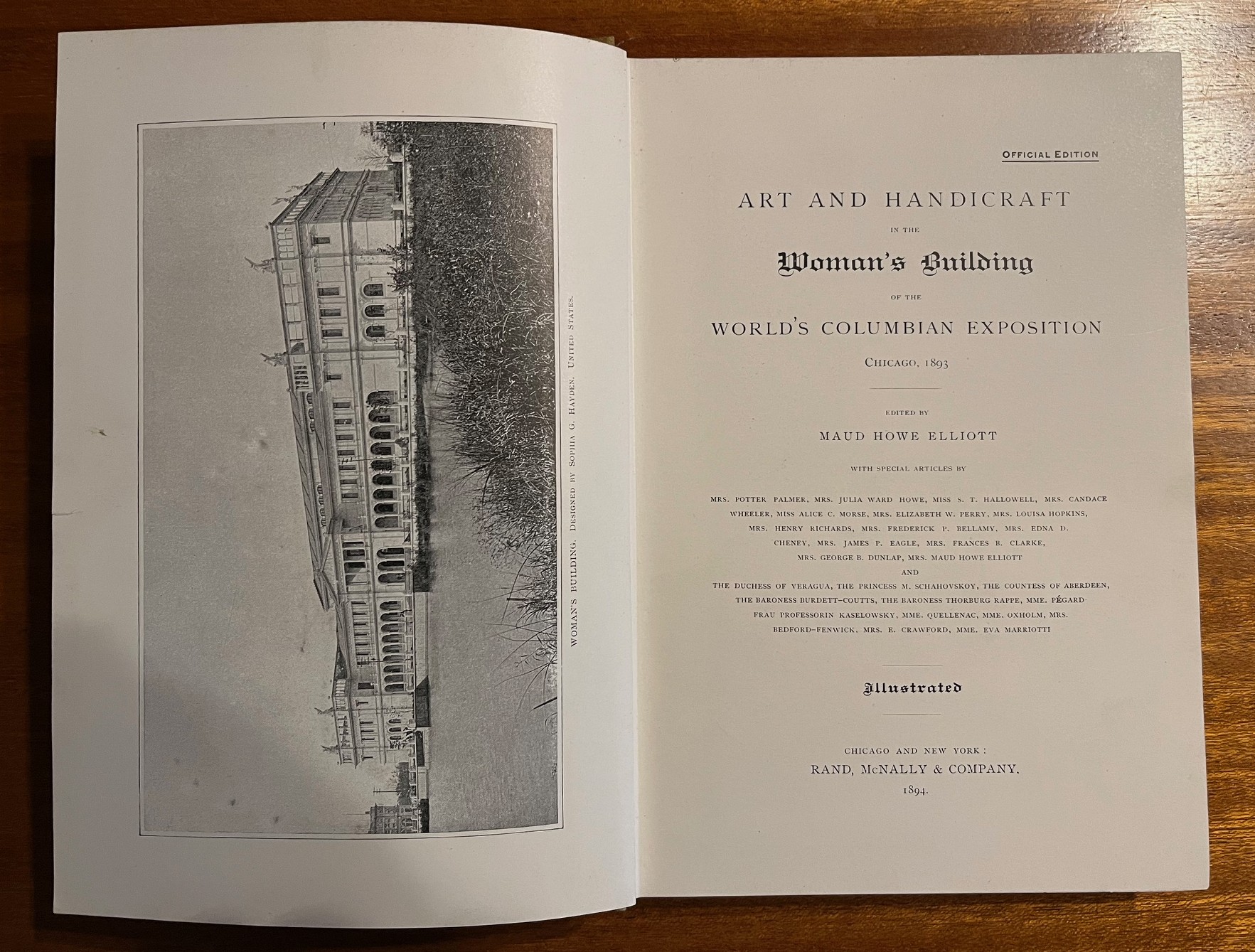 According to the title page, this is the “Official Edition” of “Art and Handicraft in the Woman’s Building of the World’s Columbian Exposition” , aka the Chicago World’s Fair of 1893.  Edited by Maud Howe Elliott, and includes an article by Candace Wheeler, who designed the interior of the Woman’s Building and was one of the leading decorative artists of the Arts & Crafts Movement.