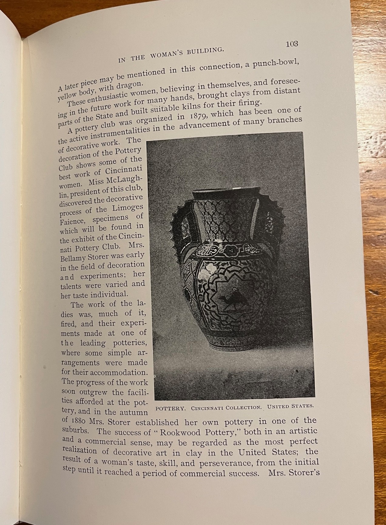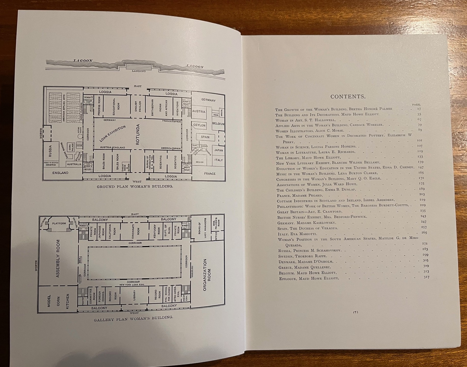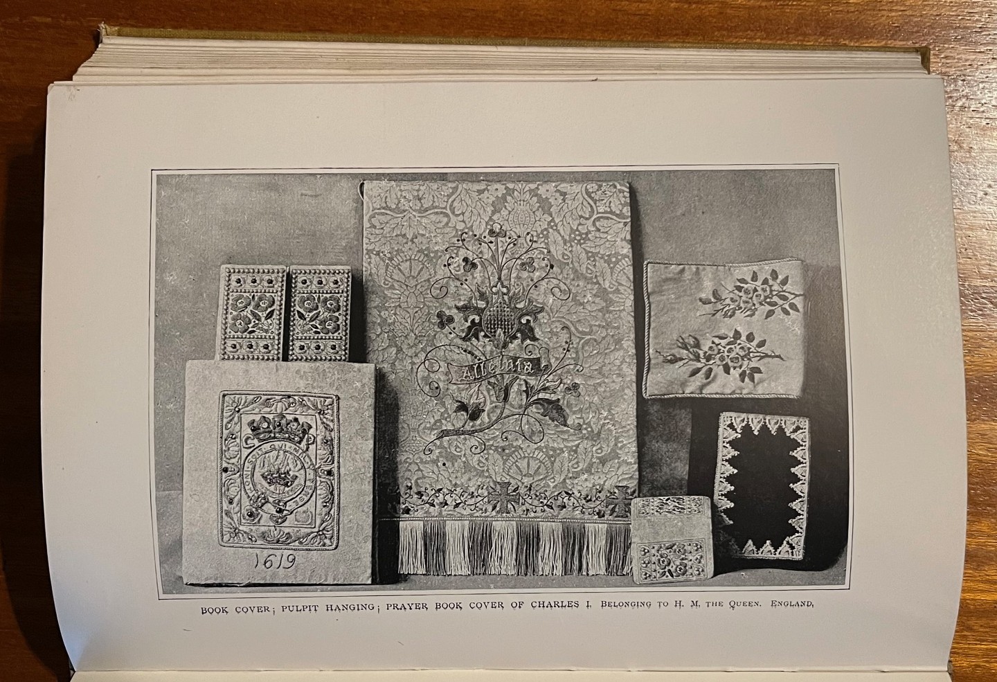 According to the title page, this is the “Official Edition” of “Art and Handicraft in the Woman’s Building of the World’s Columbian Exposition” , aka the Chicago World’s Fair of 1893.  Edited by Maud Howe Elliott, and includes an article by Candace Wheeler, who designed the interior of the Woman’s Building and was one of the leading decorative artists of the Arts & Crafts Movement.
